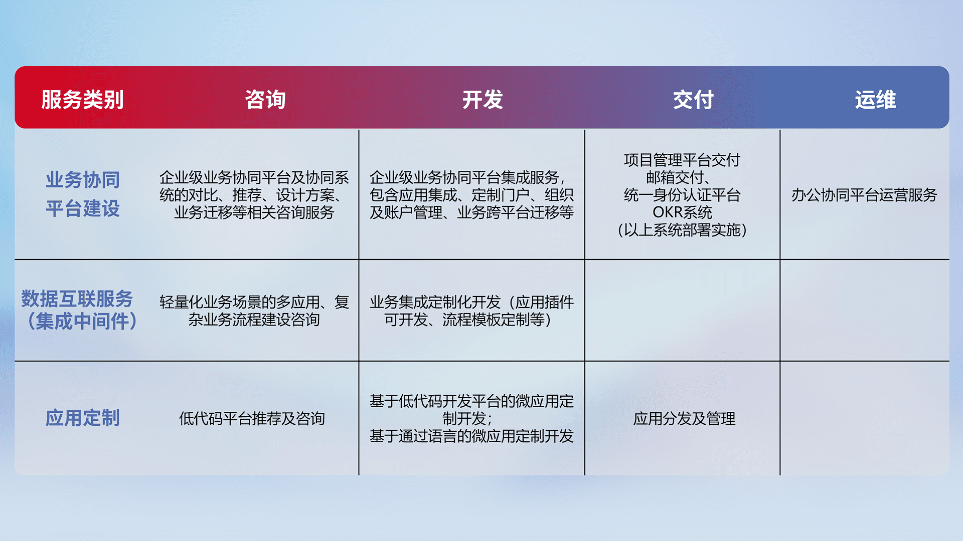 针对钉钉、、企微、、、、IDaas等平台级产品提供产品的规划、、、、方案、、、、交付、、定制化开发等服务,,,,实现如统一协同办公、、、智能客户服务、、、、混合会议管理、、、智能数据查询、、、等业务场景,,实现数字化转型。。。。
